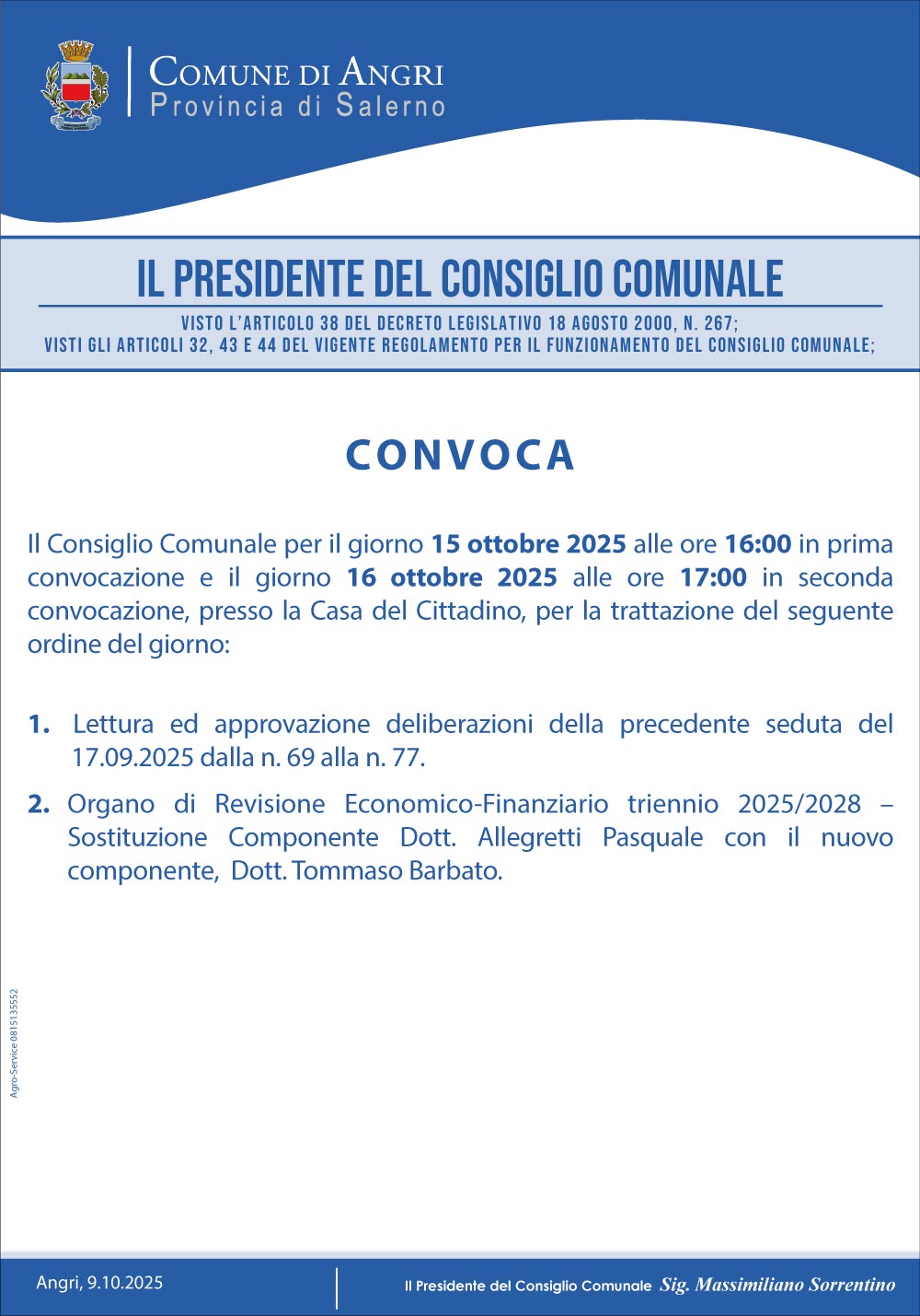 Consiglio Comunale 15 Ottobre 2025 alle ore 16:00 in prima convocazione e il giorno 16 . ottobre alle ore 17:00 in seconda convocazione